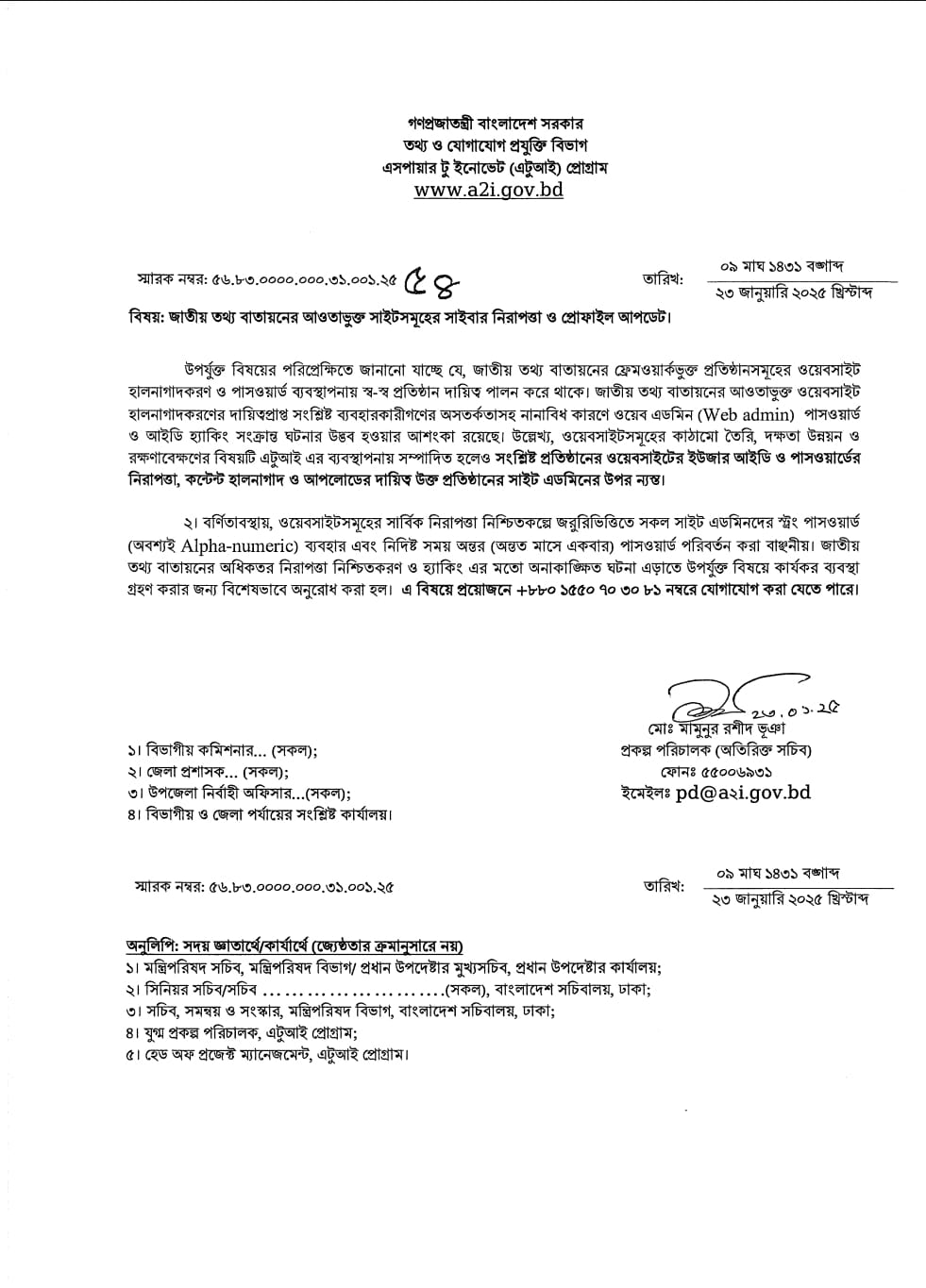 ১ এয়োদশ জাতীয় সংসদ নির্বাচনকে কেন্দ্র করে তথ্য যোগাযোগ প্রযুক্তি অধিদপ্তর, জেলা কার্যালয় , দিনাজপুর - এর "সাইবার নিরাপত্তা সেবা হেল্পডেস্ক" স্থাপন প্রসঙ্গে। ০৮-০১-২০২৬ দেখুন ২ ICPV (সরকারি চাকুরিজীবী) নিবন্ধন নির্দেশিকা ২২-১২-২০২৫ দেখুন ৩ বাজেট ২০২৫ ২০-০৭-২০২৫ দেখুন ৪ নিজ নিজ দপ্তরের ওয়েব পোর্টাল নিয়মিত হালনাগাদ এবং সাইবার নিরাপত্তা জোরদার প্রসঙ্গে মন্ত্রিপরিষদ বিভাগের নির্দেশনা। ১৩-০৫-২০২৫ দেখুন ৫ জাতীয় তথ্য বাতায়নের আওতাভুক্ত সাইটসমূহের সাইবার নিরাপত্তা ও প্রোফাইল আপডেট। ২৩-০১-২০২৫ দেখুন ৬ ডিজিটাল ল্যাবের নাম পরিবর্তন ১৫-১০-২০২৪ দেখুন ৭ উপজেলার সকল দপ্তরকে নিজ নিজ পোর্টাল হালনাগাদ এর জন্য অনুরোধ করা হল। ০৪-০৯-২০২৪ দেখুন ৮ ‘স্মাট বাংলাদেশ’ ও ভিশন ২০৪১ সম্পর্কে গৃহীত কর্মপরিকল্পনা ১৩-০৩-২০২৩ দেখুন ৯ ডিজিটাল ল্যাবের তালিকা, খানসামা, দিনাজপুর ২৯-১২-২০২২ দেখুন ১০ ডিজিটাল ল্যাব পরিদর্শনের ছক ০৯-০২-২০২২ দেখুন